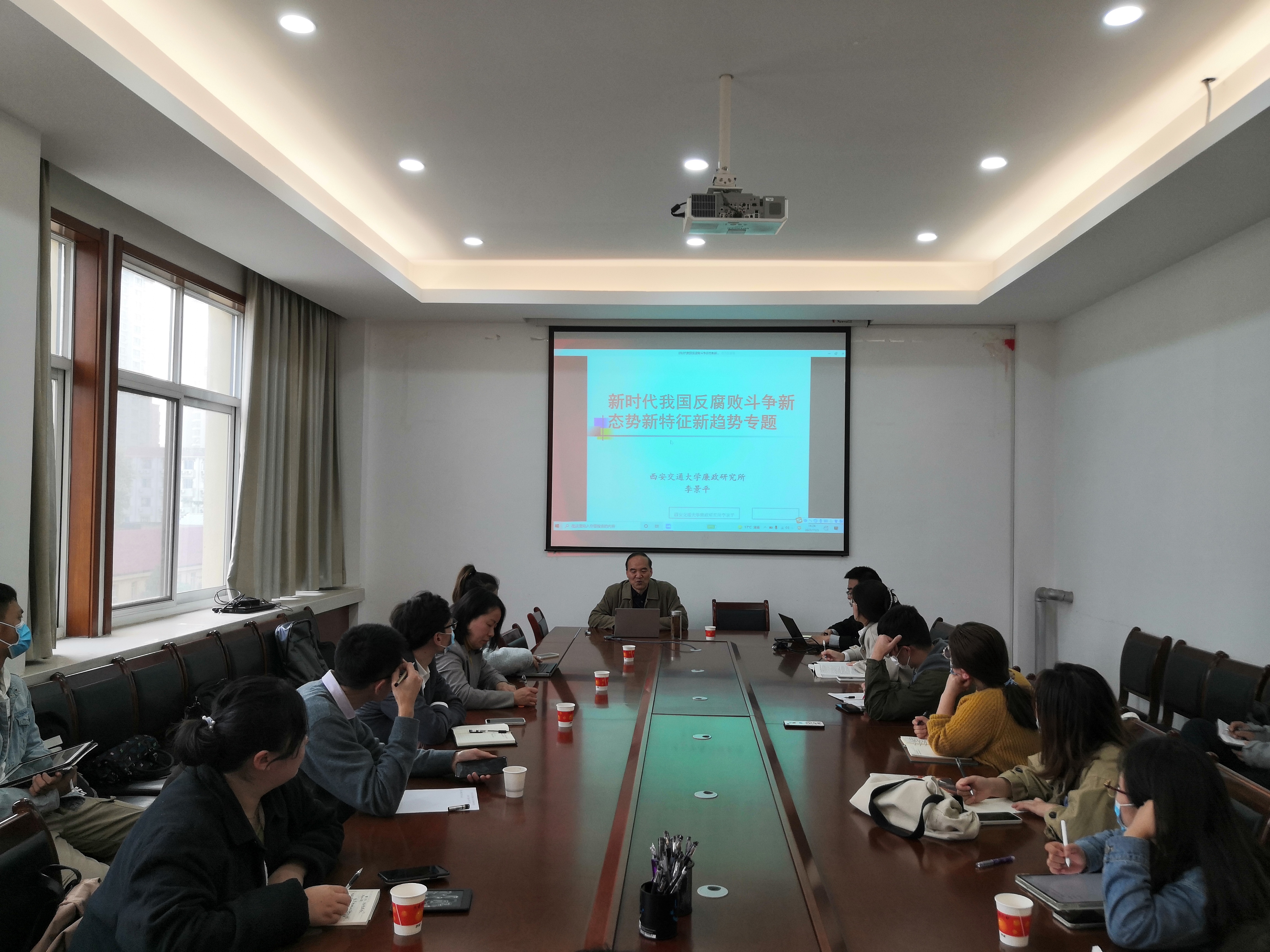 2021年11月3日下午,由葡京娱乐场 监察法学科、监察法教研室、监察法教研室党支部主办的“长安纪检监察论坛”第九讲在葡京娱乐场 雁塔校区进行,并同时以腾讯会议形式在线上同步进行。西安交通大学马克思主义葡京娱乐场 三级教授、博士生导师李景平做《新时代我国党风廉政建设和反腐败斗争新态势新特征新趋势研究》专题讲座。博士生导师褚宸舸教授主持并担任与谈人。副教授郑宁波、岳智慧博士、马宁博士以及张泽博士担任与谈人。葡京娱乐场 研究生、本科生三十余人通过线上线下的方式参加了讲座。