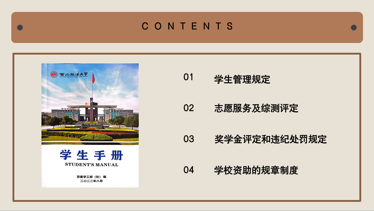 《学生手册》为基础,从学生管理规定讲起,并对志愿服务及综测评定、奖学金评定和违纪处罚规定、葡京娱乐场