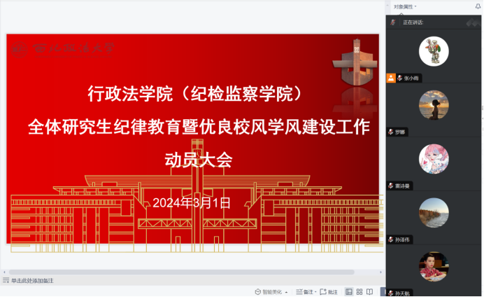 2月29日晚,葡京娱乐场 召开纪律教育暨学风建设动员大会线上会议,硕士研究生辅导员罗娜及全体研究生参加会议。