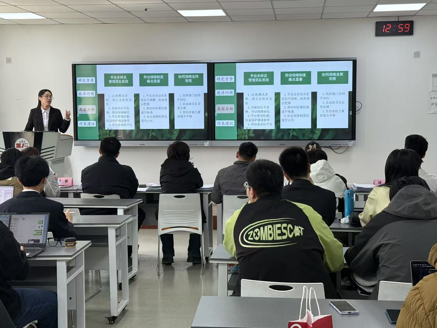 经过激烈的角逐,何锟团队展示的“新就业形态劳动者权益保障研究——基于西安市新就业群体权益保障的调查报告”荣获一等奖,宋雨森团队展示的“乡村振兴长效赋能的法治解码——基于脱贫家庭返贫防控的实证研究与制度创新”和 赵心童团队展示的“互联网时代下大葡京娱乐场 园文学生态困境与突围——基于国内多所大葡京娱乐场 园文学调研”荣获二等奖,“陕西省新就业形态劳动者社会保障现状与路径优化研究”等六个团队荣获三等奖。