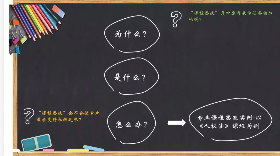 马思洁老师从“为什么”“是什么”“怎么办”的角度介绍了自己对课程思政的理解,并以《人权法》课程的教学为例,提出了贯穿于课前课中课后的全过程、链条式的课程思政模式,课前收集问题、独立调研,课中集思广益、踊跃表达,课后深度思考、共同成长,实现专业课程与思政元素的有机融合。马思洁老师还就课程思政建设中的课堂创新问题提出了自己看法。