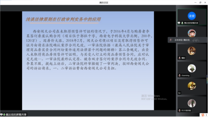 承办。西安铁路运输中级法院魏国庆法官在线上进行了“浅谈法律原则在行政审判实务中的应用”的主题分享。