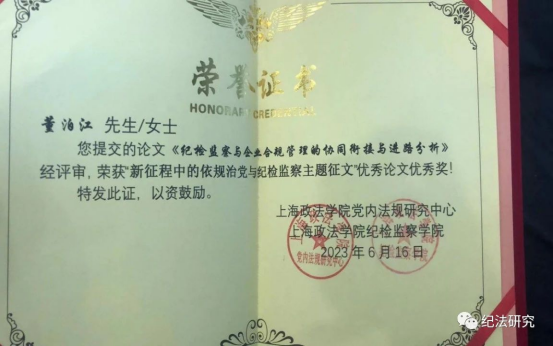 经专家评审,葡京娱乐场 2022级硕士研究生董泊江撰写的《纪检监察与企业合规管理的协同衔接与进路分析》荣获“新征程中的依规治党与纪检监察理论研讨会”的优秀论文奖。