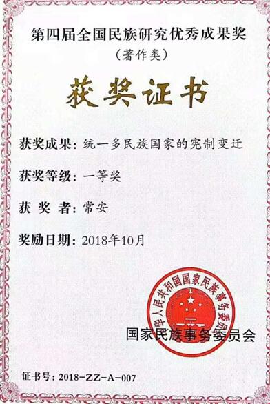 常安教授的专著《统一多民族国家的宪制变迁》获全国民族研究优秀成果奖著作类一等奖,杨军博士生的论文《少数民族非物质文化遗产保护探究》获全国民族研究优秀成果奖论文类三等奖。