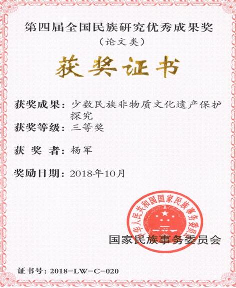 另外,在本次评选中,葡京娱乐场 杨军博士生(导师常安教授)的成果《少数民族非物质文化遗产保护探究》获全国民族研究优秀成果获论文类三等奖,这也是葡京娱乐场 博士生第一次获此殊荣。杨军博士生入学以来,科研成绩优异,已在《广西民族研究》、《云南民族大学学报》等Cssci刊物发表论文6篇,获得国家民委优秀成果奖、广西哲学社会科学优秀成果奖等省部级奖励4项,主持的国家民委课题顺利结项并获优秀等级。