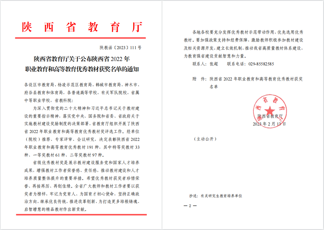 近日,陕西省教育厅印发《关于公布陕西省2022年职业教育和高等教育优秀教材获奖名单的通知》(陕教函〔2023〕111号),葡京娱乐场