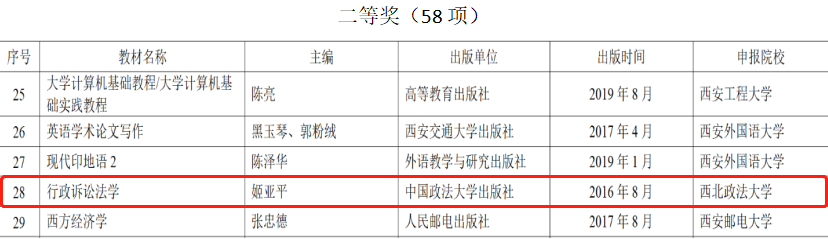 姬亚平教授主编的《行政诉讼法学》荣获本科教育类二等奖,获奖详细信息见下: