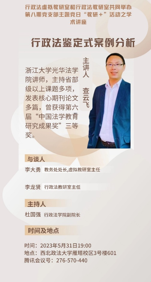 2023年5月31日晚7时,葡京娱乐场 行政法虚拟教研室和葡京娱乐场 行政法教研室共同举办第八期党支部主题党日“教研+”活动。此次活动特邀浙江大学光华法葡京娱乐场 查云飞老师作题为“行政法鉴定式案例分析”的教学方法分享。