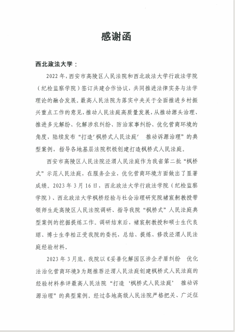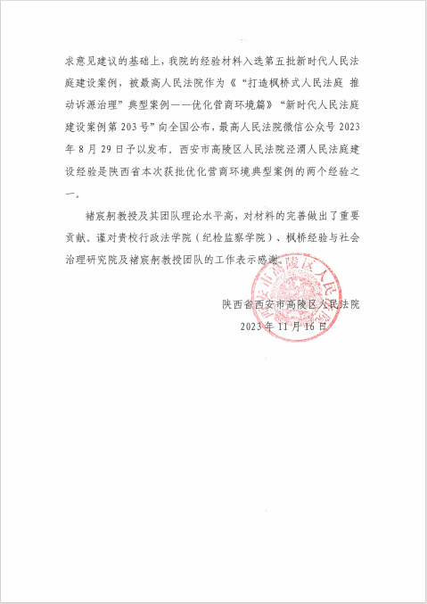 2022年,葡京娱乐场 与西安市高陵区人民法院签订共建合作协议,通过多项合作共同推进法学理论与法律实务的融合发展、互促互进。今年3月以来,褚宸舸教授受高陵区人民法院委托,带领团队指导该院“枫桥式”人民法庭典型案例的挖掘提炼工作,总结泾渭人民法庭相关经验,形成《陕西省西安市高陵区人民法院泾渭人民法庭 妥善化解园区涉企矛盾纠纷 优化法治化营商环境》的典型案例,经过各地高级人民法院严格把关、广泛征求意见建议,入选最高人民法院第五批新时代人民法庭建设案例。这一经验总结作为陕西省本次获批的两个优化营商环境典型案例之一,近日被最高人民法院作为《“打造枫桥式人民法庭 推动诉源治理”典型案例——优化营商环境篇》“新时代人民法庭建设案例第203号”向全国公布,最高人民法院微信公众号2023年8月29日予以发布。