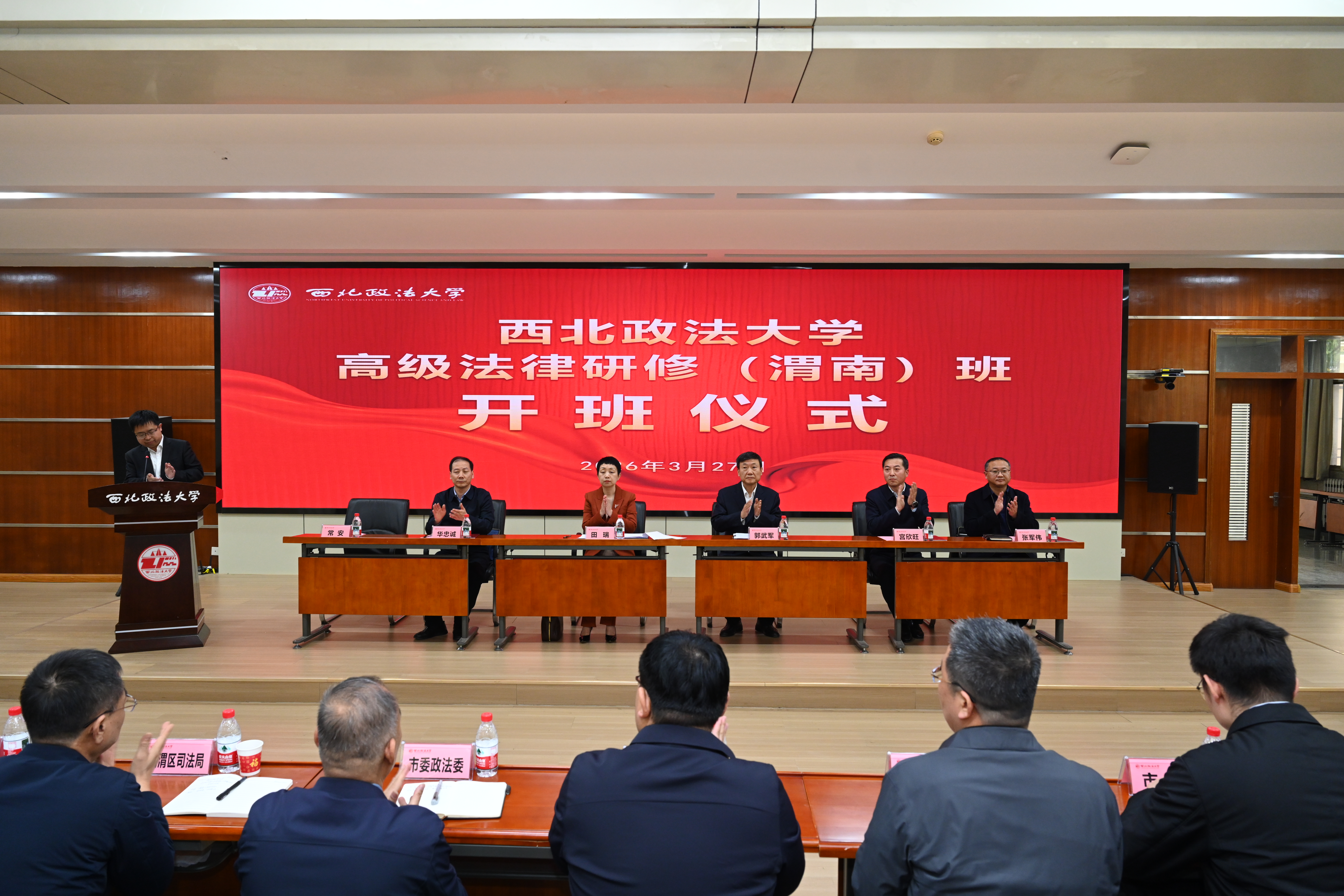 开班仪式由副校长常安主持。党委副书记郭武军出席会议并致辞,省委依法治省办秘书处处长华忠诚,渭南市市委常委、组织部部长田瑞,渭南市司法局党组书记、局长宫欣旺,渭南市委组织部副部长张军伟等领导及全体参训学员参加仪式。