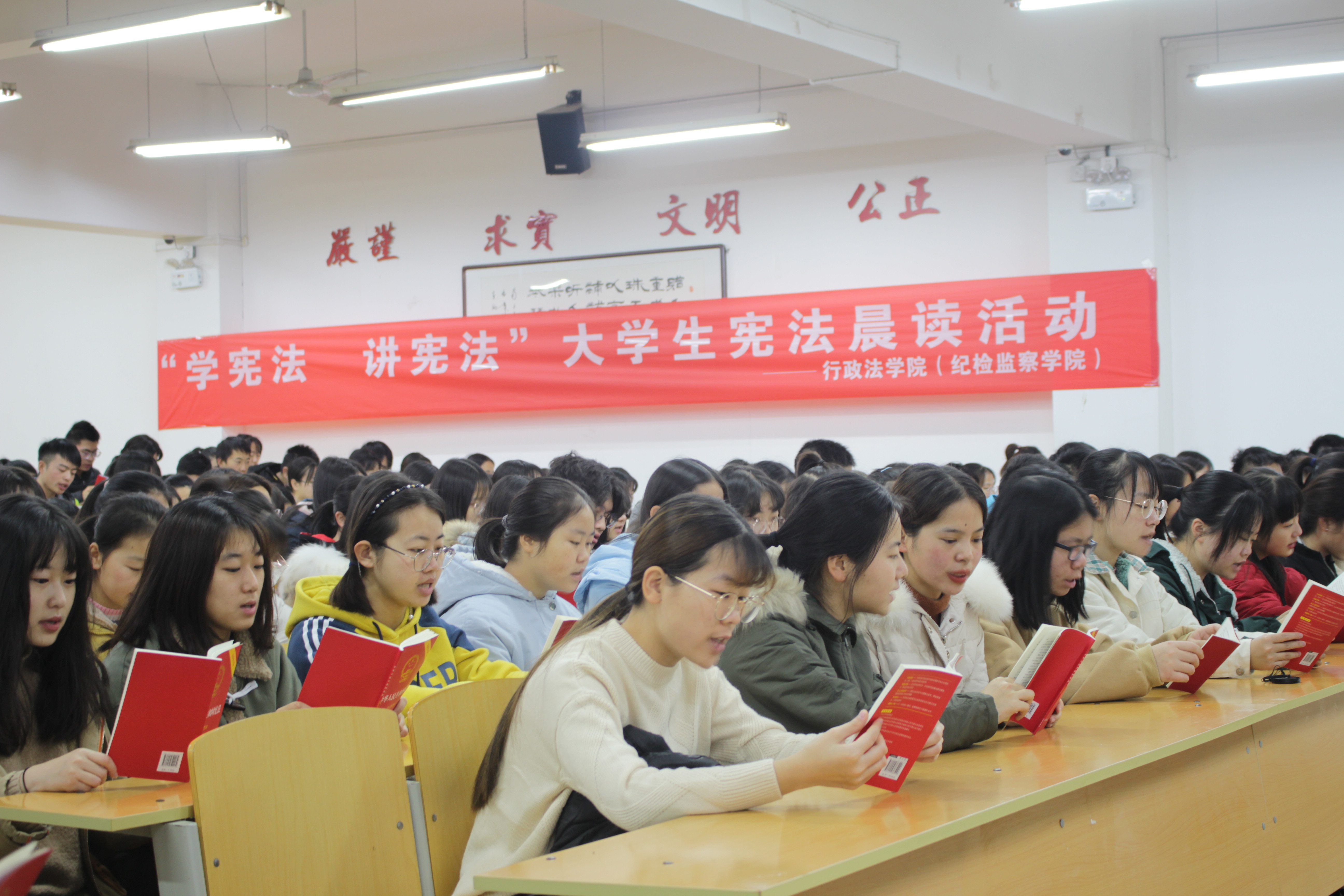 2019年12月3日清晨,葡京娱乐场 2019级全体同学在晨读教室AJ33开展了“学宪法 讲宪法”大学生宪法晨读活动,同学们通过领读与自由诵读等多种方式,仔细阅读宪法法条,全面了解宪法法规,增强了同学们懂法、守法、爱法的意识。
