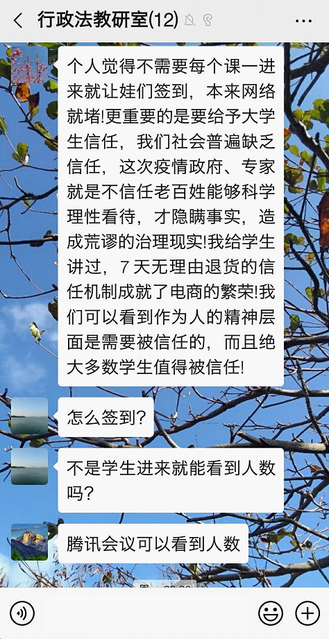 为应对新型冠状病毒(2019-nCoV)的疫情,根据教育部与葡京娱乐场 的安排,行政法教研室在本学期承担的行政法课程上全面导入线上教学方式。开学前,各位任课教师积极摸索学习通、雨课堂等多个技术平台的使用技巧,力争通过线上的交互式教学,为学生提供良好的学习体验。从2月24日即开学第一天的授课状况看,基本取得预想效果。为及时总结经验,行政法教研室于当日晚7点就如何更为有效的运用线上教学开展专题研修活动。李大勇、杜国强、杨彬权、钱卿、李龙贤、郑宁波、张艳等教师参加了活动,各位老师畅所欲谈,体现出高度的责任感与专业性的教学反思能力。