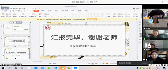 此次答辩过程包括学生论文陈述和教师提问两个环节,学生们通过腾讯会议屏幕共享PPT的方式,从选题背景、论文结构、写作方法、创新与不足几个方面进行陈述,答辩小组老师随后进行点评和提问,学生进行答辩,同时老师就论文中存在的主要问题提出了修改意见和建议。整个答辩过程组织有序、程序规范、师生交流融洽。虽然答辩地点从教室换到了线上,但同往年现场相比等质同效,取得了较好的结果。