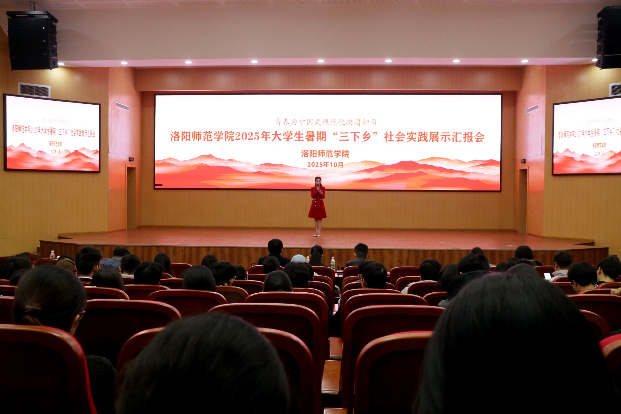 在G1-112报告厅举行2025年大学生暑期“三下乡”社会实践展示汇报会。校党委副书记曹玉涛出席,党委宣传部、党委学工部、校团委部门负责人以及书院党委副书记、团委负责人和300余名学生代表参加。