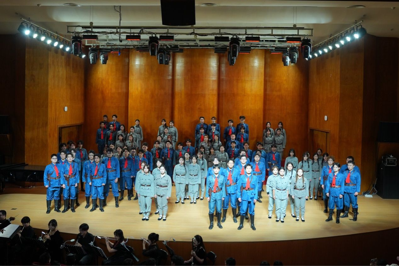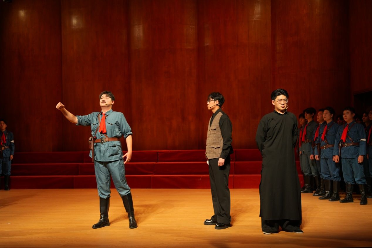 学生们饰演的角色演唱的《枪杆子,命根子》《等待这一刻》《往事重现》《我找到了当家人》《我要枪》等“信仰强音”引爆全场共鸣。激昂的演唱、深情的诉说,让观众仿佛穿越时空,沉浸式感受革命先烈的英勇无畏与坚定信念,为全体师生上了一堂立体鲜活的红色教育思政课。